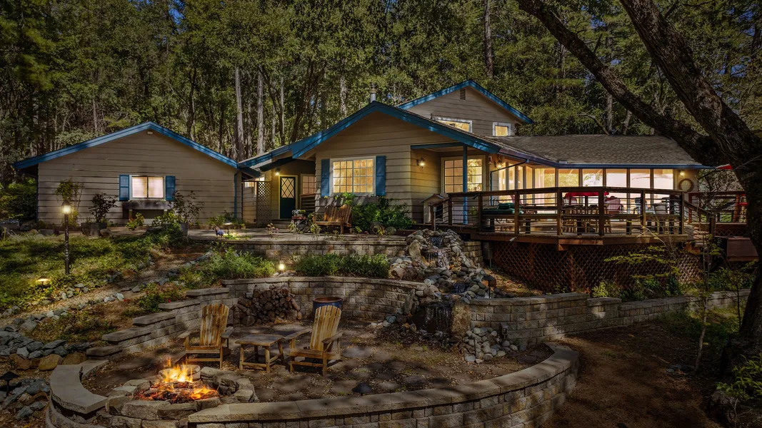 Live in your own private resort that includes a separate detached cabin. Features a living area with a beautiful rock fireplace and wood beam ceilings, and a kitchen with views, island, pantry and lots of cabinets. Entire upstairs is your primary suite with a fireplace, sitting area and balcony, and newly remodeled third bedroom with bathroom has a separate entrance. Enjoy stunning views of Lake Camanche and beautiful sunsets while listening to the waterfall as you gather around the firepit. This entertainer's dream has a large deck with a built-in hot tub, solar heated pool and tiki hut, RV space with hookups plus walking trails or ATV riding. This fenced and gated property includes 2-car garage, carport, additional detached garage, whole house generator and built-in fire system to activate. Solar energy efficient house, hi-speed internet that is ideal for remote working, and irrigation systems throughout for the flourishing landscaping, rose garden and fruit orchard. Newer HVAC, water filter system, kitchen appliances and pool equipment.