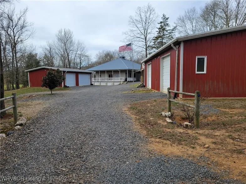 Auction 4/12/2025 @ 11 am. This incredible retreat-like property features an approximately 1,607 sq ft, 3-bedroom, 2-bath home with a spacious open kitchen/living area and a wrap-around deck perfect for taking in the serene views. The home boasts a durable metal roof and rural water, complemented by a well for watering plants. The property includes a variety of outbuildings to enhance your lifestyle. A 30 x50' insulated metal building with a slab floor offers two 10' roll-up doors, a loft for extra storage, and a 2-post 8,000 lb lift. Additionally, there is a 24 x36' insulated 3-car garage with a slab floor and two roll-up doors, a 22 x40' pole building, a 12 x32' unfinished cabin that would make an ideal guest house, a 12 x20' garden shed, a 2-car carport, and an 8 x12' well house. The property is secured with an automatic gate and spans approximately 6.4 acres, providing ample space...