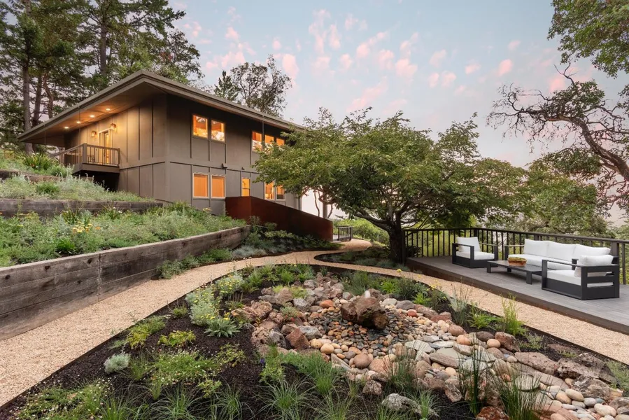ARCHITECTURAL DIGEST MODERN OF ULTIMATE VIEWS! EXCLUSIVE GATED COMMUNITY, WOODSIDE SCHOOLS, HEART OF SILICON VALLEY LIFESTYLE! Bespoke architecturally singificant modern overlooking the Bay. Private natural wonderland with the Peninsula's best Bay vistas. Custom designed in 1991 by celebrated architect Paul Gilger, it's no wonder this home takes on cinematic qualities: around the same time Gilger was crafting this modern opus, he was masterminding the film studio of George Lucas, the legendary Industrial Light and Magic in San Rafael. *3 bed/3 ba in main house + ADU with bed area, office area, kitchen & full bath. *Lower level of main home makes a Zen Office, Lounge, or Family Room * Bold Open Concept * Unobstructed water views * Extensive new landscaping of handpicked native plants and organic design *2-story staircase nearly 30 feet high as work of art * Indoor/Outdoor w/ view dining decks and flat pad to rear * Immersive privacy beyond circular motor court * Tons of Sunlight * New Fountain Courtyard * Backup Generator, Tesla Charger in huge 3-car garage *Architecturally significant bespoke caliber, served by two gates: one at Central Woodside's Bear Gulch/Woodside Road, and upper gate at Skyline, not far from Mountain House Restaurant and easy Highway 92 connection