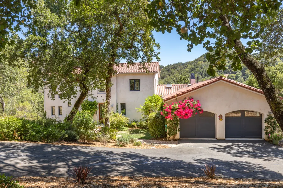 Perched above and overlooking Carriger Creek canyon in Sonoma's Western hills, this striking gated residence, with a Mediterranean flair, reflects the creativity of the architect owner builder. A two story great room with walls of glass frames the lush forest and slopes of Sonoma Mountain. The 3 bedroom 3 (2-1)bath 2600 square foot home nestled in the Oaks on 6+ verdant acres exudes a sense of peace and serenity. An open floor plan features a double fireplace serving the great room and dining area with a spacious balcony. The bright, open cooks kitchen with stone countertops, custom cabinetry and large island has lovely views and an inviting spot for friends to gather. The master suite is complimented with colorful concrete floors, high ceiling and a private balcony. A striking open staircase leads to the upper level with additional bedrooms and bath, all with views and enhanced by skyli...