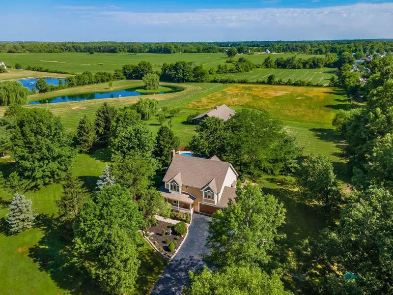 Rare opportunity to own acreage in Lewis Center! This well-maintained property offers first floor living and includes an additional 300 SF 4-season room! Hand scraped 3/4'' hickory floors on main level, newer high-quality carpet in most of the upstairs. Finished basement space creates yet another level of living. Enjoy a heated in-ground pool with waterfall and diving board, covered front porch, large back deck, and a 2400 SF horse barn! The barn has propane hook-up and is complete with water and electricity. 7 stalls, each with an outlet and a light. Stall doors are beautifully custom made! Additional storage in loft and running fan in cupola. Nearly 4 acres of pasture behind the barn is fenced and tree lined. Enjoy peace and privacy with mature landscaping and a 750' driveway.