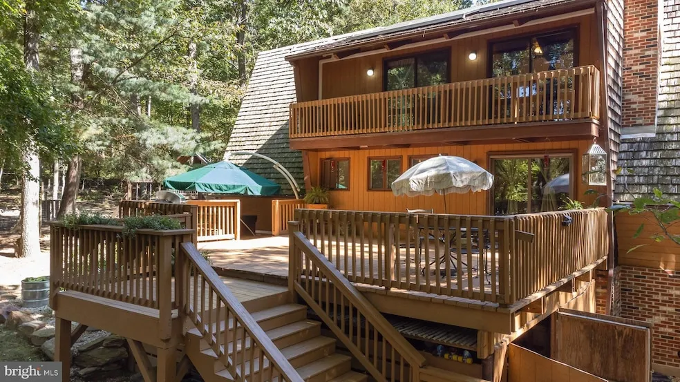 Welcome to this private oasis on 6.5 acres, with 4 bedrooms and 3 full baths in the woodlands of Northern Harford County. Pull into the long wooded private driveway which ends in a circle with parking pads allowing over 10 parking spaces. The house is positioned in the middle of the property to ensure maximum privacy and the grounds are gorgeous and have been improved with walking trails, gardens with planters, Koi fish pond with mature fish and filtration system, a barn and chicken coop with fencing, a bonfire area with custom built adult swingsets, a playground and treehouse with a sandbox, and a 10X20 shed with double barn doors. This Acorn A-Frame is made of Canadian Red Cedar Wood, and is entirely cedar wood inside and out offering a warm, cozy living environment. The house has 4 decks on every side of the home giving a beautiful panorama of the forest, with one of them holding a hot tub. Inside on the main level is a massive living area with exceptionally high vaulted ceilings, wood burning fireplace and triangular windows/french doors allowing a full view of the forest. Off of this area is a dining area that opens into the kitchen with granite countertops, an extra large pantry, deep farm sink, open live edge shelving and live edge breakfast bar. Down the main hallway is a large laundry room with washer/dryer, a full modern bath and a large primary suite with high ceilings. Taking the stairs to the top floor brings you to a loft that overlooks the living room with clear views of the treetops and sky and another full modern bathroom, and three bedrooms all with vaulted ceilings, two of which have their own private balconies. Taking the stairs to the basement brings you to the semi-finished above ground basement which has another full modern bath, a large recreation room with wood burning fireplace, office area and storage. This basement could potentially be convereted into a walk in (no stairs) in-law suite. There is a mudroom for jackets and shoes, and also a kids fort under the staircase. This home was designed with intention and for energy efficiency, the heating and air both run off of mini splits throughout the home, there is a whole house fan, Anderson windows with roll out functions, all new ceiling fans throughout, and owned solar panels that support the electric usage. It is supplied with great well water sitting on a geographic high elevation ridge line. The finishes and layout offer the perfect ambiance with the custom woodworking, the layout, bronze accent fixtures, warm amber lighting, live edges etc. This home offers the ideal experience for all four seasons, surrounded by nature with vibrant fall colors, snowy winters by the fireplace or the lush greens and flowers that summer has to offer. This is the. ideal place to raise a family, or enjoy relaxing in your later years. Come see this gem today!