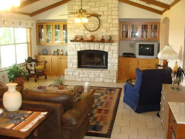 Great Hillside views, 3 bedroom 3 bath home, one bedroom and bath is actually guest quarter with a separate entrance, large living room with rock gas fireplace, wood and tile floors throughout the house, 8 ceiling fans, 2 car garage, security system, large patio area with fishpond, great landscapihng, large workshop or studio with water and sink, lots of cabinets,barn property on south side of tract is about 10 ft. North of fence line, garage and one bedroom/bath was built in 1988 and balance of house in 1992, house has been updated and looks great.