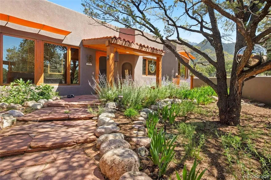 Welcome to "The House with No Corners," a 3bd, 2ba masterpiece designed by Sacred Geometry architect David Yarbrough. Built as a result of a dream and envisioned originally with a drawing in the sand, it uses Rastra insulated concrete forms on a slab below freeze level for excellent climate control. Rounded edges and sculpted arches are made from the Rastra, and covered in skip trowel plaster, separating rooms throughout the home. Oversized windows offer stunning Sangre De Cristo Mountain views, with handmade interior doors by a local artist. The atrium, once an art gallery for Yarbrough s watercolors, features large south-facing windows for passive solar gain, complementing in-floor radiant heat and slate floors. The living room centers on an antique round fireplace, while the kitchen is visually designated by unique cross shaped Spanish tiles and includes dark wood cabinets, stainless steel appliances, and a large mountain-view window. A screened porch off the dining room is ideal for summer dinners. The third bedroom/flex room was once used as an architecture office and a real estate office, and now is used as a bedroom. It includes water/sewer access in the floor for a potential future bathroom. Down the hallway, a small bedroom with exterior entrance shares a hallway full bathroom. The primary suite includes a meditation room based on the square root of Pi to amplify the energy inside, a large custom closet built into the hallway, and a primary bathroom with a soaking tub overlooking natural land and a valley view. The primary bedroom relays the feeling of being nestled in trees. The roof, engineered for wind and snow, was replaced in 2022. Situated on 6+ acres in Baca Grande Chalet I, with a two-car garage, lawn, and fenced gardens, this secluded cul-de-sac retreat is a must-see virtual tour.