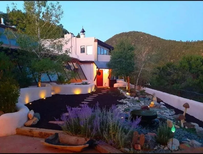 This one of a kind, eco-conscious, EARTH SHIP hybred is a must see! This Artisan home showcases hand made details in every corner, breathtaking vistas and an exquisitely landscaped patio that perfectly frames the stunning views. Indulge in ultimate relaxation watching big Taos skies from the hot tub, while the lower patio with a bar offers a delightful space for entertaining. Enhancing the ambiance, six fireplaces are strategically placed throughout the home. The primary bedroom features a charming Kiva fireplace and overlooks a serene lily pond. The state-of-the-art kitchen boasts an Italian pizza oven, catering to culinary enthusiasts. Additionally, a separate guest house provides ample accommodations for visitors or for use as a rental property. This remarkable home is an architectural work of art designed by the renowned Taos architects Reynolds and Kolshorn. Offering the option of functioning "off-grid," it is equipped with electric power, cisterns, and water catchment systems. Alternatively, it can seamlessly transition to solar power and utilize a well. Strong wifi connectivity, cable, and a land-line connection ensure convenient communication. The residence is a true work of art, nestled harmoniously within the enchanting woods. Meticulously crafted with local expertise, it features intricate details and showcases a world-class art collection. Prepare to be enchanted by this private, magical oasis that offers tranquility while being conveniently located near town, Taos Ski Valley, and Taos County Airport.