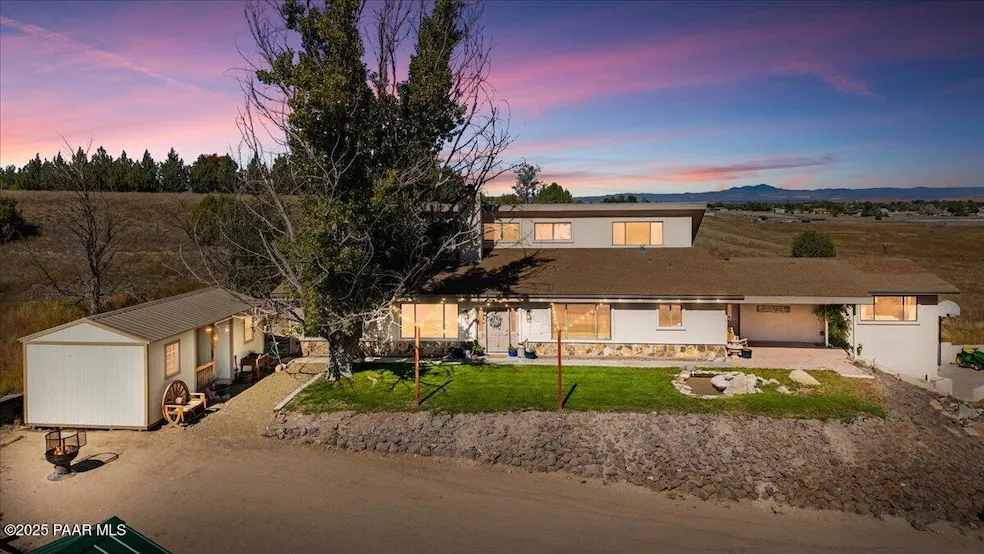 Embrace the beauty of wide-open spaces and single-level living on nearly 7 acres of usable land, offering panoramic views of Granite Mountain, Mingus Mountain, and Little Thumb Butte. This inviting 5-bedroom, 2-bath home spans over 3,300 sq ft of open, comfortable living space designed for both function and flexibility. Step inside to find bright, open-concept living areas featuring durable vinyl plank flooring, a tankless water heater, and multiple gathering spaces--including both a family room and a living room. The spacious primary suite provides a peaceful retreat, while the home's warm finishes and thoughtful layout create a welcoming, easy-flow feel throughout. Outside, the property truly shines. A fully finished detached shed offers the perfect spot for a home office, art studio, or guest space. The land is beautifully developed with raised garden beds, mature trees, a grassy yard...