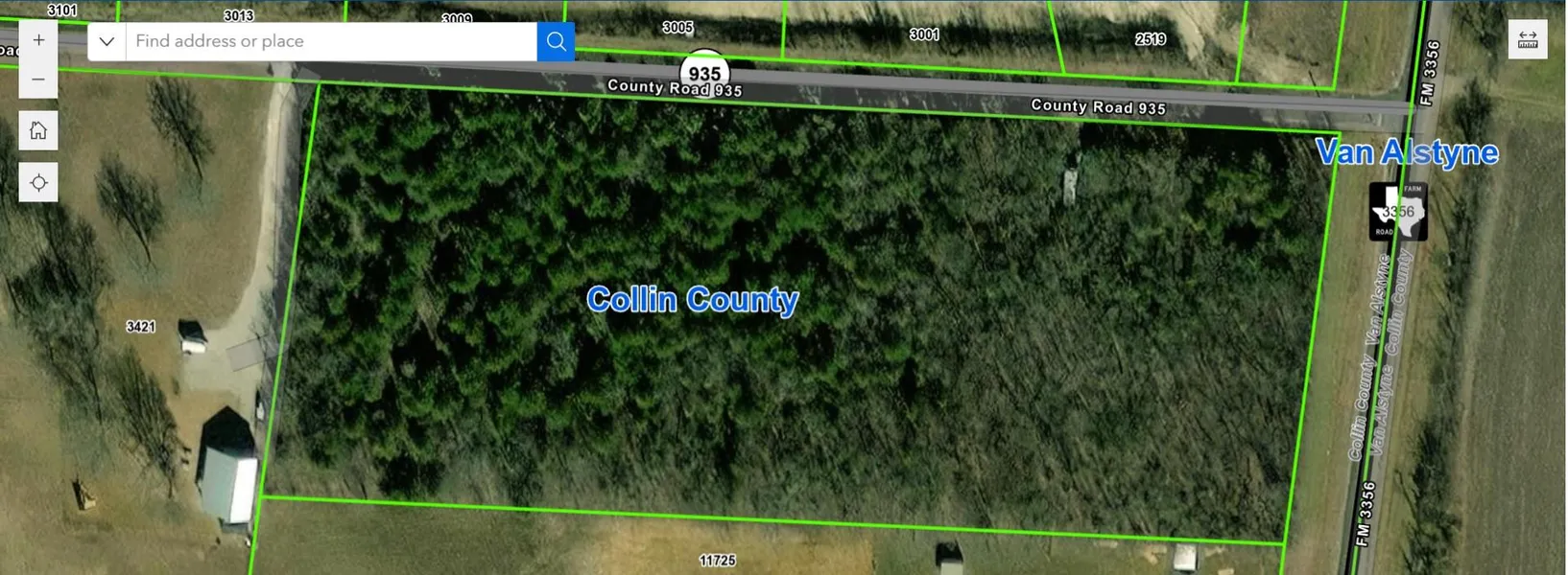 Unique heavily wooded property southwest of Van Alstyne at the SW corner FM 3356 and CR 935. Neighboring properties are homes on acreage and large lot subdivisions. Create your own private setting on this pristine property!