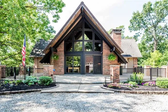 CHARMING and UNIQUE custom BRICK 3bd/2ba nestled among the trees on 6 private acres.You'll feel like you're on vacation everyday with this lovely A-FRAME style home with expansive picture windows! Open sight lines from the kitchen, great room and dining room. Cooking in this charming kitchen will be a breeze with the abundance of counter space and 2 separate breakfast bar areas. The large dining room has built-in buffet cabinets, hardwood flooring, crown molding and access to the inviting newer composite deck. The master bedroom has 3 closets, en suite and private balcony. IMPRESSIVE detached 3/CAR brick garage with additional maintenance door is ready for all the toys! There's a finished multipurpose area above the garage with walk-in closet. The main home features a tuck under garage too, perfect for a workshop! The property has multiple beautiful aggregate patios and sidewalks & vinyl...