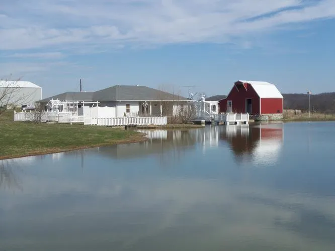 Lovely three bedroom two bath earth contact home setting on 6 acres m/l. Home has open living rm/kitchen/dining room and beautiful wood cabinets, trim and woodwork throughout. With traditional heating and cooling, but also has a wood burning stove ducted throughout. Lovely landscaping including a pergola leading out onto the dock and pond.