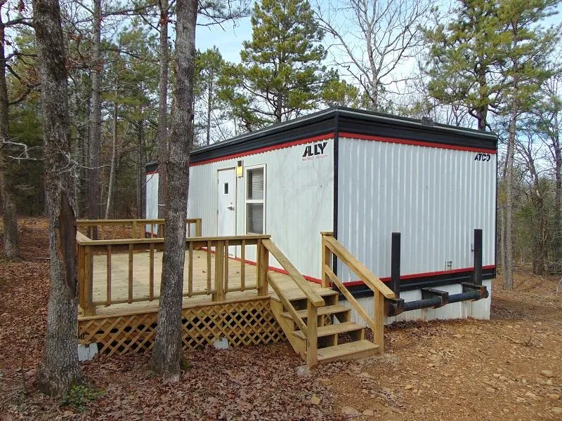 NICE REMOTE CABIN on 6 acres in the mountains of Southeast Oklahoma in LeFlore County, Oklahoma. This property has a 700 square foot two (2) bedrooms, two (2) baths cabin, with a large front wood deck and central heat and air. The cabin has electric, no water or septic to cabin, electric stove, refrigerator, water heater, washer and dryer. The land is wooded with a mix of large pine/hardwood trees.