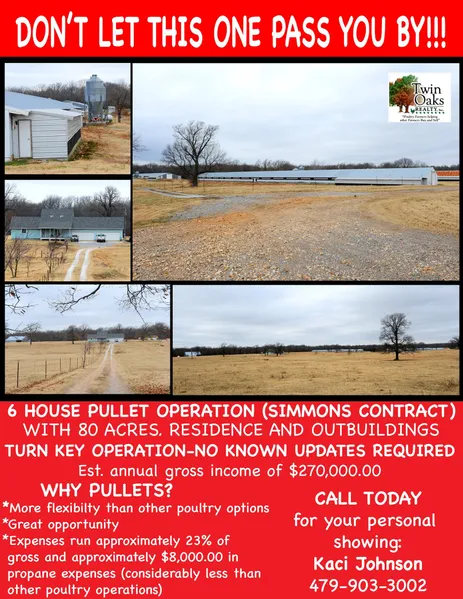 6 (40x350) steel truss Pullet houses in operation with a Simmons contract in place, sits on 80 acres MOL (pasture land) with a cattle operation option and 2000 SF residence. The poultry houses were updated in 2011 (full update - solid walls). 20 week birds, Loop feeders, Ziggity water lines, radiant heat, 4' cool cells, 2 Generators, 3 wells, propane, Rotem controllers. This is a turn key operation with gross income of estimated $270,000.00/annually. The expenses run 23% of gross (per seller), approximately $8,000.00 in propane expenses/annually.