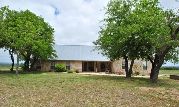 Nicely finished 3 bed/2.5 bath, native stone home has rock fireplace, office, dining room, kitchen w/wrap around breakfast bar, breakfast area banked by windows taking in the views, master suite with exercise room, 2 car attached garage, covered wrap around porch with those endless views of town. The property also has 2400 sq ft open span barn with 6 bay tractor and equipment storage shed; guest house with efficiency kitchen, bath, office/hobby room; work shop. The 60.54 ac. has fenced livestock traps and 40+/- acres in producing coastal field. Property also fronts county road, Kuhlmann Rd.