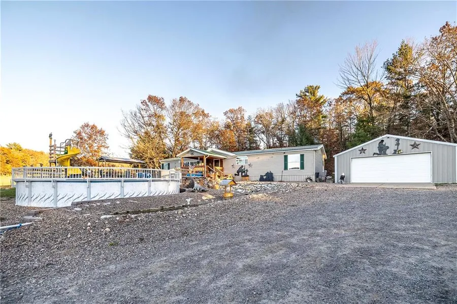 Up North -Bring the horses! This spacious three-bedroom, two-bath manufactured home, with over 2300 sq. ft. Built in 2003,steel roof (2014), Elevated on 16-inch piers, enjoy country living with an included 40x80 pole shed featuring a workshop and recreation room, a 30x40 three-sided shed for horses, pasture, and an above-ground pool with a slide on a deck. Nestled on 60.61 acres, this property offers an outdoor enthusiast's paradise with hunting and ATV access at your doorstep. These owners purchased with a VA loan. The house sits on (40) 16 inch Piers that are 8 feet deep. Easement to neighbor cabin in back. The outbuildings have 2 x 6 purlins in the roof structure, extra thick gauge of steel, hundred amp, electric, and water in the shop. The septic is a three tank at grade system. Approximately 30 acres are fenced.
