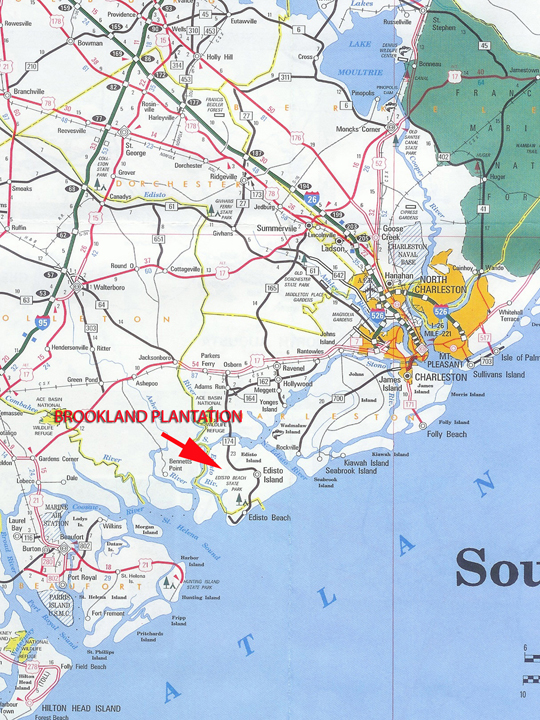 Brookland Plantation on Edisto Island boast historic features listed on the National Register of Historic Places and substantial frontage on Shingle Creek . It contains diverse habitats including maritime forest, saltwater marsh, sandy areas, orchards, evergreen upland forest, and open water. The Greek Revival house was built circa 1803 and totally restored in 2004. During its most recent renovation the house was painted a pluff mud color to blend into the tree trunks and surroundiing landscape. The views include spectacular marsh vistas, an open pecan grove, a pond and numerous live oaks draped in Spanish moss. The plantation's traditional uses are protected under a conservation easement with the Low Country Open Land Trust.