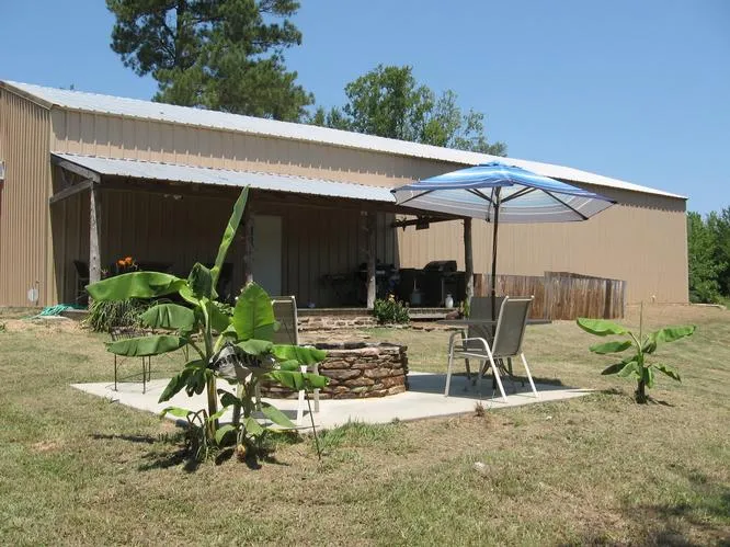 rustic porch and patio with stone fire pit situated for beautiful view overlooking lake and food plot