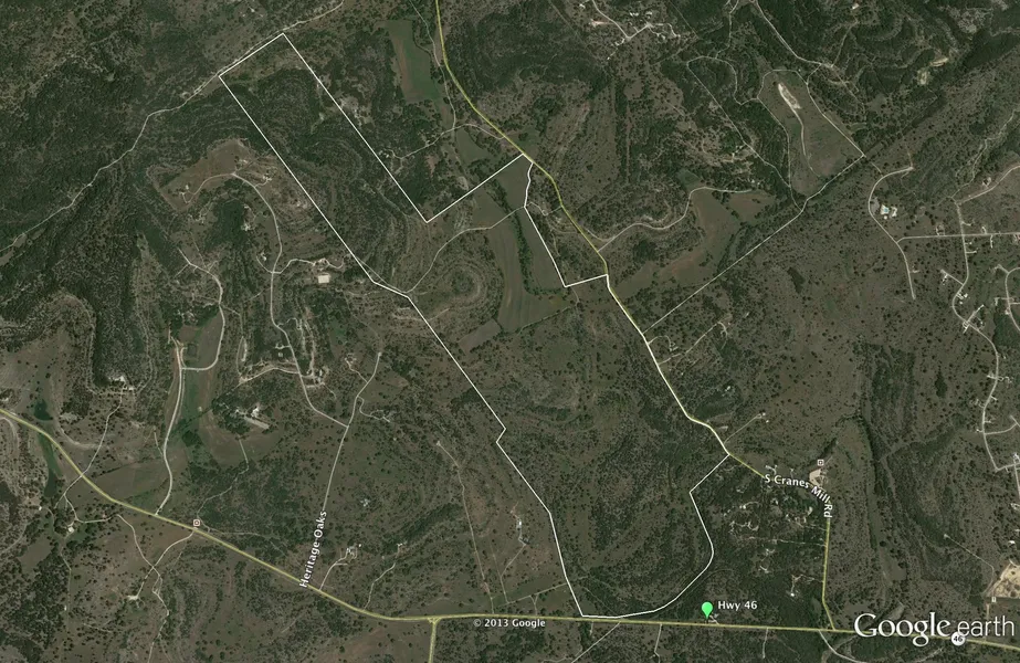 West of New Braunfels on Hwy. 46 West with 1,131 feet frontage on Hwy. 46 West and 3,750 feet frontage on South Cranes Mill Road. 3/4 mile west of the intersection of Hwy. 46 West and South Cranes Mill Road on the north and Herbelin Road to the south. 1/2 mile east of the intersection of Hwy. 3009 and Hwy. 46 West. Rolling scenic Edwards with elevations of 1,200 feet in the lower area where there is a wet weather creek and 1,300 to 1,400 in the upper area with fantastic views for 2.5 miles, with a varying width of 1,500 to 3,300 feet.