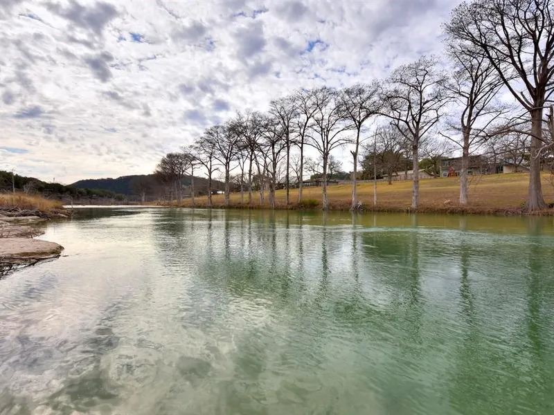 Enter the property and meander through the beautiful mature trees to discover 4.89 acs of tranquility and privacy. Home sits on a high bluff overlooking the pristine Blanco River and has NEVER flooded. Take the gentle rock steps down to swim, sunbathe and enjoy your 260 of riverfront makes for a valuable asset. Open floor plan for socializing is filled with natural sunlight. Large covered deck provides stunning views of the river and is perfect for entertaining.