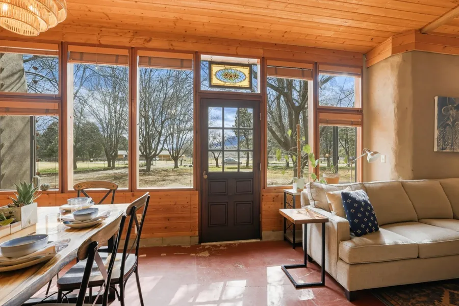 Live Eco-Friendly in the Green Belt! Highly desirable but rarely available Rammed Earth Home designed by world famous architect Michael Frerking sits on over an acre of fenced, level, flood irrigated land with private well and two outbuildings. NOT a cookie cutter home!! 3 1/2 foot thick walls and passive solar design keep house warm in winter and cool in summer for minimal footprint. Home has 12 foot high tongue and groove wood ceilings throughout. Property is ideal for events or short term rentals, and allows for Horses and livestock. Also RV parking with 220V power and water / electrical vehicle charging. Kiva style fireplace on the large patio is ideal for evening entertaining, and horseshoe pits for day time fun! Welcome to paradise! Special property for Eco-Minded Clients. Unlimited Potential for STR/Special Events, See Attached Income Projection. Add solar and have Zero Utility Bills forever! Homes like this almost never come on the market, so don't drag your feet or you will miss out on this golden opportunity.