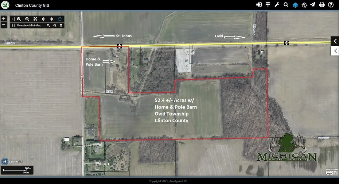 Located in Clinton County between St. Johns and Ovid with frontage on both M-21 and St. Clair Road, sits this 52.4 acre property! The 2 bedroom home with attached garage on a full basement sits on 5 acres with a 16x24 pole barn with extra room to roam out back. The remaining 47.4 acre parcel consists of approximately 32 tillable acres and 15.4 acres of woods. This is a great property centrally located off of a main road for endless possibilities and/or opportunities. All of the land is high and dry except for the Smith & Potter Drains that run through two different locations. The tillable fields provide income and the woods and tree lines offer great hunting and recreational activities. The woods consists of mainly hardwoods with many mature trees for possible timber value and there is even a small rustic cabin that could be cleaned up and used as deer camp! Great properties in th...