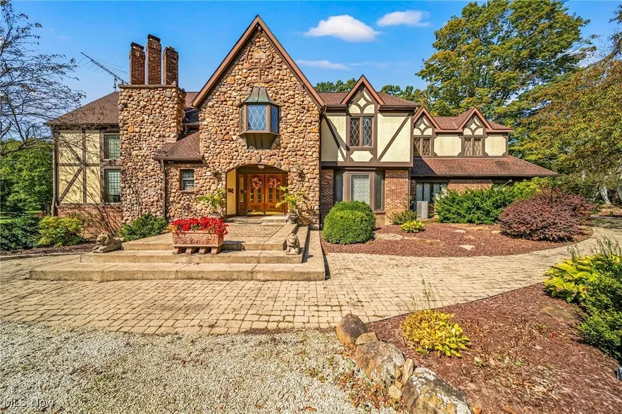 This architectural masterpiece is a rare find! An English Tudor estate meticulously built over 30 years with craftsmanship and detail rarely seen today. Surrounded by 61.25 serene acres, this property offers timeless elegance, luxurious living, and a tranquil country retreat perfect for nature lovers and outdoor enthusiasts. Step inside and be greeted by exquisite woodwork throughout, including rich cherry wood in the living room and hand-hewn beams in the back family room, sourced directly from the property. The two-story living room is a showstopper, featuring a dramatic wall of windows and an open view of the upstairs library. The expansive chef's kitchen is designed for both function and entertaining, complete with two refrigerators, dual stovetops with double ovens, and two dishwashers. A first-floor office provides convenience and privacy, while four spacious bedrooms each feature their own private bathrooms. The grand master suite is a retreat in itself, with French doors that open to the rooftop of the original home. Its lavish walk-in closet doubles as a dressing room, outfitted with built-in dressers and organizers. Downstairs, the finished lower level is an entertainment haven?featuring a full bar, pool table, air hockey, and skee ball for endless fun with family and friends. Outdoors, the property is a hunter's dream, offering wooded acreage, a private pond, and open land for recreation. A large outbuilding provides the perfect space for a workshop, car collection, or equipment storage, while a second smaller outbuilding adds flexibility. A circular front drive and additional rear drive leading to the two-car attached garage complete the estate.