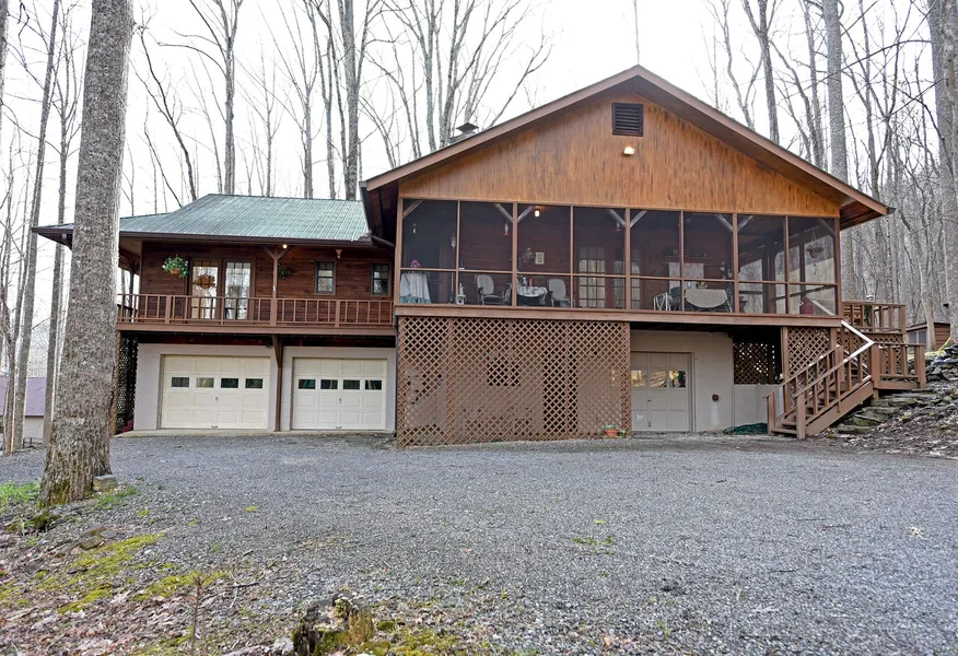 Wildlife Abounds In this Trackrock Community that Joins US Wilderness. A True Mountain Home.. 3BR/2BA on 1.95 Acres of Hardwoods & Big Boulders. 3 CAR Garage in lower level Plus detached RV Parking Carport. No Grass to mow. Custom Cabinets and lots of closets & storage. Generous Master Bedroom, Double doors throughout the house leads to the full wrap porch and Lovely Screened porch. Great Room offers Vaulted Ceiling with mix of sheetrock and wood. Chair Lift from lower level to main floor assists with mobility. Laundry on Both floors. Private exit for lower BR. Large workshop area. Open Deck and Rustic setting.