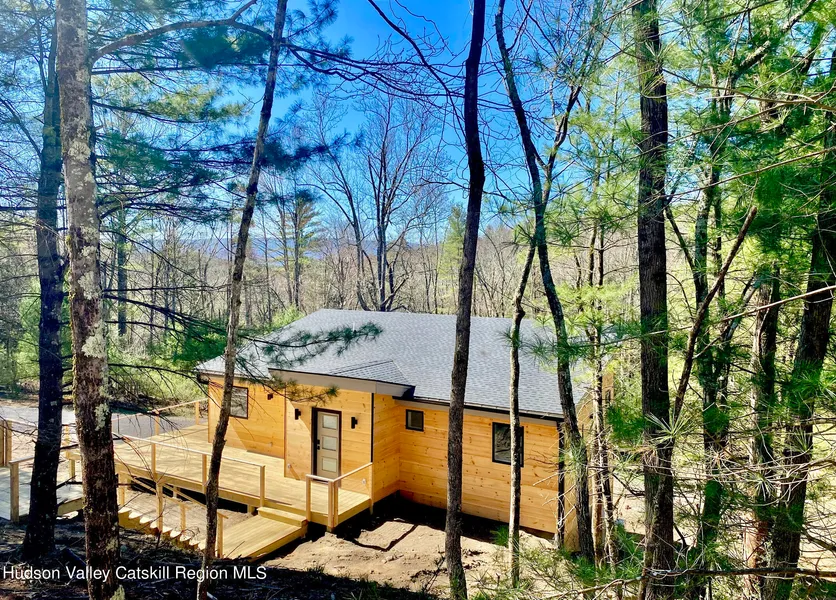 NOW AND (sooooo beautifully) ZEN a fresh and fabulous new home build in very sought-after Kerhonkson! Fantastic layout. Expansive great room upstairs for optimal light and views..bedrooms downstairs. Every room is LIGHT-WHITE-BRIGHT AIRY and one immediately feels refreshed from the outside world. A detached garage near the upper driveway w/ potential for an ADU/ office/art studio that is plumbed w/ electric behind it is all set to be finished as per one's needs. The stairway and catwalk connecting the garage placement to the main entry makes entering the home very dramatic and DEFINITELY a fun little journey. Generous deck off the catwalk. Upon opening the front door one is immediately struck by the views of the forest and Gunks peeking through the trees from the very open plan great room. Sunlight cascades unto the hardwood hickory floor and bounces off the walls. Crack open any window and the Mettacahonts Creek can be heard rushing at the end of the 5 generous acres. The heart of the home is the spacious kitchen with a large island perfect for entertaining and ample storage. Countertops are very beautiful artful granite w/ character. Convenient powder room off the kitchen. The wood stairs to the lower level leads to 3 bedrooms: main bedroom is ensuite. The other 2 bedrooms share a bath. Both spacious full baths have clean, modern lines with radiant heat flooring . Two of the larger bedrooms have doors to the back yard with loads of possibility for a future patio w/ a hot tub / or a sauna. Clean energy efficient mini splits are the main heating / cooling for the home. BE That home owner that has a home entirely off fossil fuel! The great value is in the bones of this home: the good framing, insulation, equipment, oversized septic, ADU potential, intentionally providing a distinguishing buyer the space to add their own personal touches and finishing details to truly make it their own.The highlight of the whole offering is the fact that the Mettacahonts stream frontage is amazingly vast, gorgeous and expansive...with year round water flow and pine and hard-wood laced topography surrounding. The property location is very convenient to all of the new destination spots in the area: Arrowwood Brewery, West Wind Orchard, Ravenwood and Inness, as well as a short drive to the Vernooykill Trail Head in the Sundown Nat'l Forest, Minnewaska State Park and Mohonk Preserve. Fine dining is also close by: Mill and Main, Harana, Rough Cut Brewery and many others. Exploring other destination towns is a breeze with easy access to Stone Ridge, High Falls, New Paltz, Kingston, and Woodstock. All this and you're only 90 miles to the GWB in NYC. This thoughtfully designed home by a prominent local architect , will appeal to many, so do come and take a peek! Buyers agent to verify taxes and sq footage.