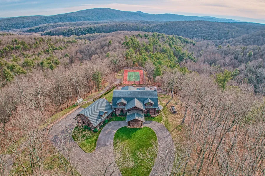 As you enter the four-bedroom main residence, you are greeted by breathtaking views of the Allegheny Mountains enjoyed from the countless floor to ceiling windows and the craftsmanship of hand-peeled Lodge Pole Pine logs harvested in Montana. The Gambrel copper roof, copper gutters, and downspouts add a touch of elegance outside, while the massive 36-foot mountai...