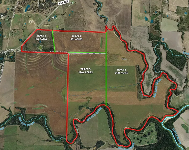 Tract 1 includes 1250ft of FM 485 frontage, pond, and fenced on 3 sides.