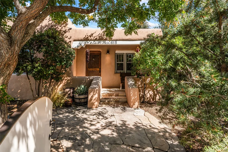 A rare Santa Fe gem – this adobe sanctuary on an oversized lot offers seamless indoor-outdoor living with a fully fenced wraparound yard. Stacked stone walls, wooden gates, a grapevine-covered arbor, and fragrant landscaped gardens create a serene setting where every window frames natural beauty. Inside, renovations preserve authentic adobe character while introducing a fresh, contemporary feel. Skylights brighten the kitchen, and the spacious great room with French doors to the courtyard is ideal for entertaining. The floor plan includes two bedrooms, a full bath, powder room, large laundry room, and a flexible study or dressing room off the primary suite. A private downstairs space provides additional storage or the opportunity for a refinished retreat. Nestled at the heart of the Railyard District, just blocks from Joseph’s Pub, Mille, Dolina, Paloma, and minutes to the Plaza, this calming home combines timeless Santa Fe charm with modern updates and unbeatable location.
