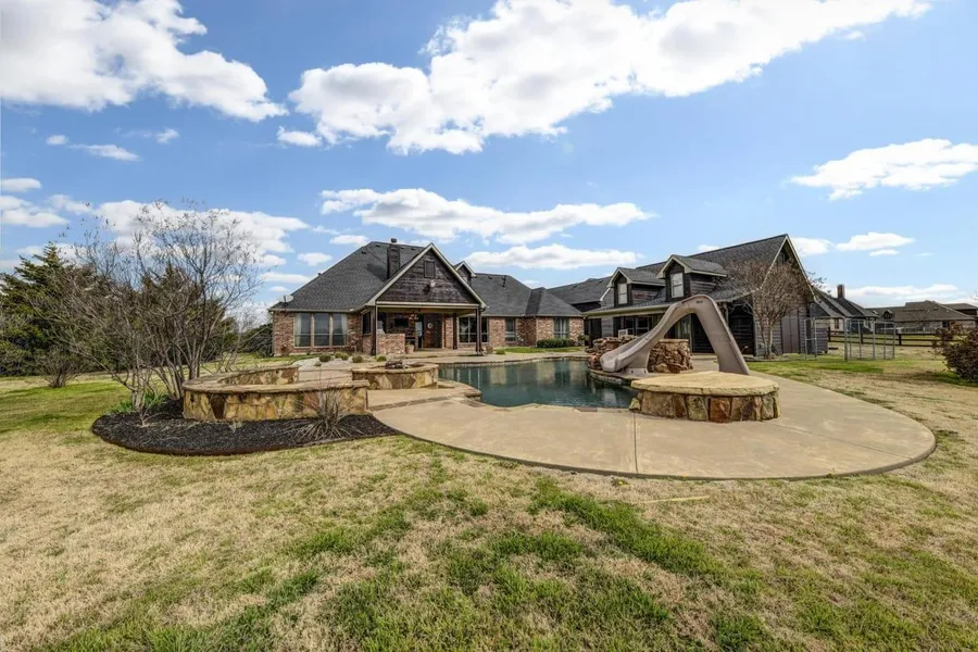 Beautiful custom home located on 2 acres just outside of Krum and within 10 minutes of I-35 and all the amenities Denton has to offer. With 6 bedrooms, a game room, a media room, multiple garages, and guest quarters this home has the space you are looking for! The gorgeous custom kitchen, large stone fireplace, and outdoor entertaining area add incredible details to this custom home. Outdoor area boasts a pool with slide, water feature, and spa, and an outdoor kitchen, the perfect entertainment space! Guest quarters feature a private entry, kitchenette, living area, bedroom & bathroom. This home has everything you need! All features, measurements & schools are subject to buyer's and buyer's agent verification.