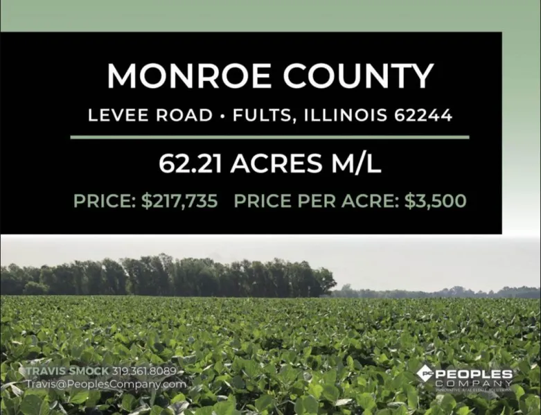 Offering 62.21 acres m/l of tillable and recreational ground along the Mississippi River in Monroe County, IL! Located just 40 miles south of St. Louis, this affordable property offers over 2,000 ft of Mississippi River frontage allowing for endless recreational opportunities. Income is provided by 22.69 FSA tillable acres carrying a productivity index of 112.5. The remaining portion of the farm is comprised of timbered areas, which combined with river access create excellent deer and waterfowl hunting potential. This land is located west of Fults, IL with good access from Levee Road and in section 23 of Precinct 15 Township, Monroe County. There is additional land available in the area.