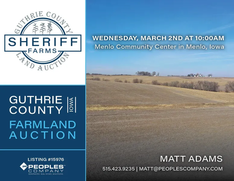 Peoples Company is pleased to be representing this sale of Guthrie County, Iowa farmland! The farmland will be offered as a single tract through a live in-person auction as well as a virtual live online auction option. The auction will take place at 10:00 AM on Wednesday, March 2nd, 2022 at 10:00 AM at the Menlo Community Center, 417 Sherman Street, Menlo, Iowa 50164. This affordable tract consists of 62.79 acres m/l with an estimated 58.10 FSA tillable acres. The farm is located within a great farming community and would be a great starting farm for a beginning farmer, an add-on to an existing farming operation, or an investment opportunity for the Buyer looking to diversify their portfolio. Currently, there are 55.41 acres being farmed with an additional 3.66 acres of grassed waterways. The farm includes a conservation plan with a corn and soybean rotation.