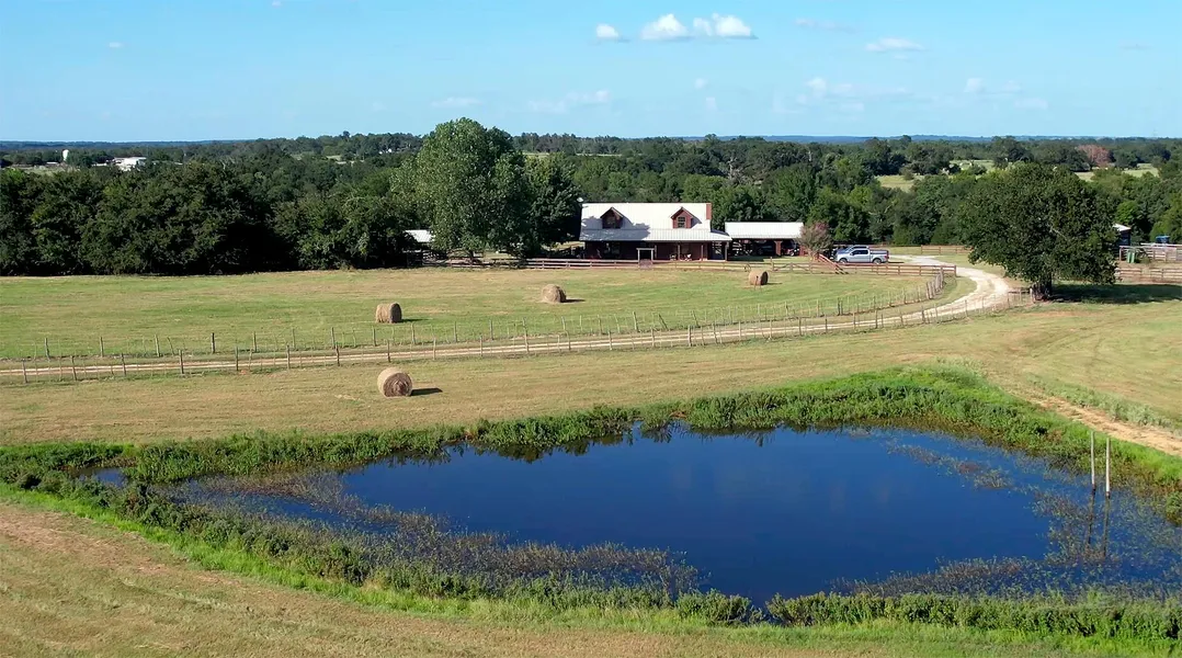There are few properties that can claim to have it all, but the 4-Bar M is one of them. After driving through the entrance and down the fence lined driveway you will begin to notice the cross fenced green pastures dotted with large oak trees perfect for your cattle or horse operation, four ponds chalked full of bass, a tree lined creek with some side walls towering 20 plus feet wrapping around the expansive 126.54 acres. After seeing the 70 plus foot elevation change from the hill top to the 10-acre hay meadow in the fertile creek bottom you start to understand how unique this property really is. At the end of the drive, you will find a traditional 2300 sq ft 3 bedroom 2-1/2 bath brick home with a metal roof. Filling the space between the home and the wood rail yard fence is a St. Augustine lawn leading to the two-car carport and the rock wall surrounding a luxurious pool and hot tub area. A wood porch wraps three sides of the home inviting a good breeze any time of the year. Inside you will notice the vaulted wood ceiling living room, rock fireplace with a few pieces of native petrified wood mixed in, and detailed stained wood trim. A large kitchen and island looking out over the pool and fields below next to a separate dining room. There are two bedrooms downstairs with a jack and jill bathroom as well as the utility room and half bath. Upstairs is an open loft for your library, office, game room, or any other needs you may have with access to the 2nd floor balcony overlooking the pool. The spacious master bedroom and bathroom are located on the second floor giving you plenty of privacy. Flanking the homesite on either side sit two barns, one with a tack room, chicken pen, and horse stalls and the other being a 42x60 equipment barn and concrete floored shop space with a 17x60 loft above. Both barns are equipped with water and electricity. Alongside the large barn there is a full set of wood cattle pens. If you need more space, you are in luck, there is a second 1,000 sq ft home on the property with one bedroom and bath downstairs and a loft upstairs. The view out the kitchen window rivals the main home looking past the oak trees at a large pond and fishing pier. Water to this home is supplied by one of two water wells on the property. Down the hill you will find the 10-acre hay meadow, 30x36 hay barn, and frequently some whitetail deer or wild hogs. If you ever wanted to escape to a cabin in the woods, there is no need to leave the place. Nestled beside another clear water pond you will find a rustic log cabin built out of cedar logs cut from the land, perfect for all your camping excursions. Whether you are looking for a homestead to work and raise your family on or a country retreat only 1 hour and 20 minutes south of Dallas and 2 hours north of Houston the 4-Bar M is the kind of place great memories are made.