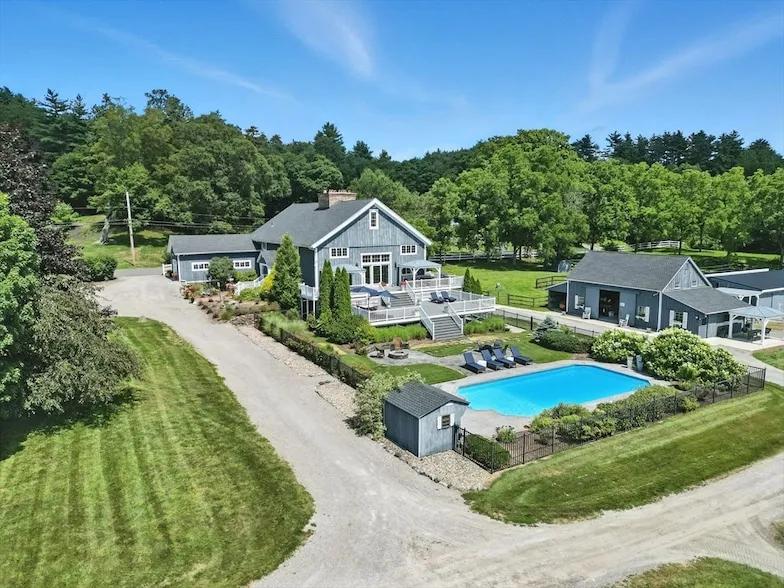 Stunning equestrian estate is harmonious blend of rustic charm & modern luxury, set against the backdrop of Minnechaug Mountain. Property features 34 stalls, 20 w/individual runouts, indoor & outdoor riding arenas, gated paddocks on lush meadows & scenic riding trails winding through woods. The home, a beautifully converted dairy farm, showcases post-and-beam construction, four-sided soaring 10'x10' brick chimney, wide pine board flooring & beamed ceilings. Interiors have been renovated throughout from the sophisticated kitchen boasting quartz countertops, original slate sink & cozy eating area w/custom upholstered bench to the renovated baths w/high-end finishes. The great room, a standout feature, features soaring 3-story beamed ceiling & oversized Pella slider w/transom windows, framing breathtaking views of inground heated pool, paddocks & rolling hills. An idyllic retreat for equest...