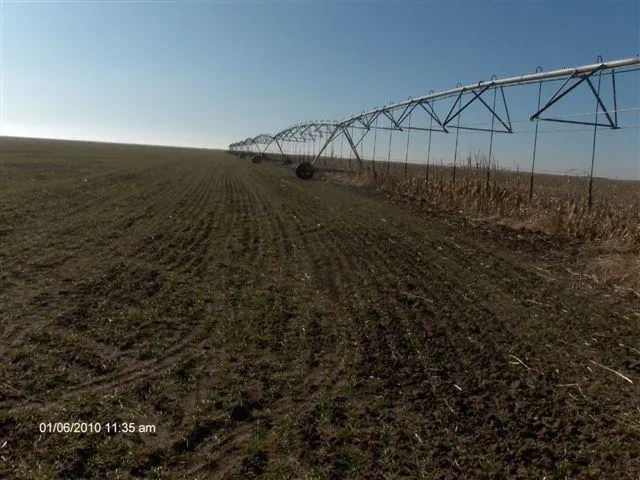 This 640-acre section (Section 160, Blk 1-T) is approximately 3 miles west of Stratford on paved County Road L. There are two -mile T&L hydraulicdrive center pivot sprinkler irrigation systems on the north half of the section. These sprinklers which are approximately 10 years old have long drops on 60 centers and large (14.9x24) tires and are thought to each be nozzeled for 450 gpm. There is one well with 8 turbine pump and natural gas engine that supplies one sprinkler at a time. An Izuzu generator is moved between pivot points to power the electrically driven hydraulic pump needed to move the sprinkler.