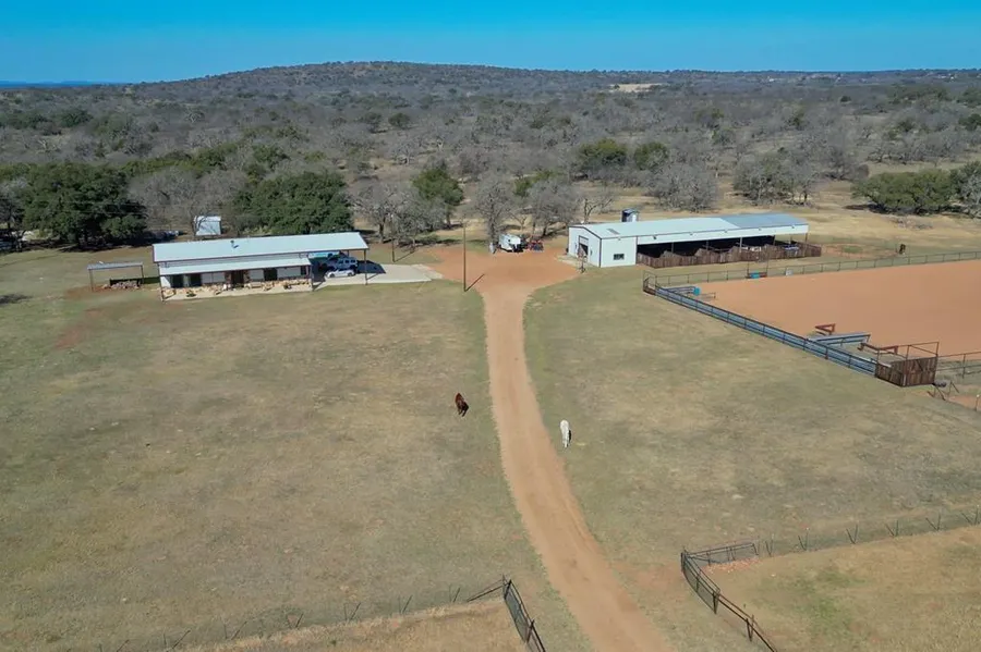 AMAZING HORSE PROPERTY!-Located 6.5 miles north of Llano, this scenic 28 Ac Ranch offers a beautiful 3/3 Metal and Rock Barndominium (2400 SF built in 2018) with custom masonry interior/exterior accents, hickory cabinets, 8 ft doors, freestanding see through fireplace, new HVAC, water softener system & lots of other custom finishes throughout. A 120X40 Metal Barn has 9 oversized pipe stalls, hay & feed storage (on slab) plus ,2-20X24 rooms with mini-splits for office, tack, gym or craft areas. There's also a 220X140 pipe arena with cattle return lane & 2 chute lead ups with lights from the barn allowing for night riding. Chicken Pen,3 sheds, 4 paddocks w/water supply to all 2 wells, 2 elec. Meters, an RV hookup, & beautiful coastal field, yielding approx. 65 to 85 round bales per year, complete the rest of the improvements on this amazing ranch. (All measurements are estimates.) The back part is heavily wooded in gorgeous live oaks, post oaks & mesquites. A large stock pond that is fed from a seasonal creek meandering through the ranch, also makes it a great hunting area. Relax & cool off at the end of the day in a quality above ground pool, which will energize you to start all over again! Backs up to 2000 Ac +/-Ranch. Bring the family to see this amazing ranch, which is conveniently located approx. 1.5 to 2 hrs. From Austin /San Antonio or Stephenville, 45 min. from Fredericksburg or 30 min. from the Highland Lakes areas and you'll want to stay! (NOT A SUBDIVISION)