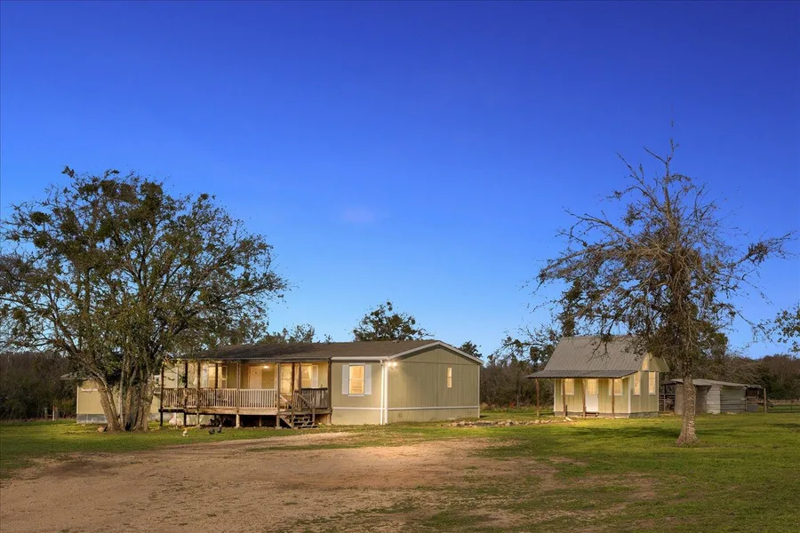 Private 17 acre farm just minutes to Lockhart! Enjoy so much privacy coupled with convenience! Currently used as a goat farm, this property has a manufactured home in excellent condition which features 3 bedrooms and 2 bathrooms. The open living concept offers a spacious and inviting atmosphere, with white cabinets in the kitchen and a large pantry. The laundry room has access to the backyard and is conveniently located near the kitchen. A covered front deck offers a lovely view of the property and the perfect place to relax! Recent updates to the main home include -- new HVAC (less than 1 year old) and the roof is less than 3 years old, a UV Filtration system, and new tankless water heater. There is also a separate, charming guest house on the property that includes a bedroom/living space, lofted bed, full bathroom, vaulted ceilings, a metal roof, and laminate flooring. There are so many opportunities for this space--income, multi-generational living, a home office. Such a nice extra! Another added bonus to the property is a cement tornado/safety bunker, as well as a large metal workshop with built in storage suitable for hay, equipment, or shelter for livestock. The property is fenced and cross fenced, and has many native mature trees, a large pond for livestock (12 Ft deep), and an additional storage building close to the home. With a septic and well (plumbing recently updated), you can enjoy off grid living! Make sure to walk the several acres of dense forest at the back of the property perfect for attracting wildlife, creating walking trails, or clearing for more farming/livestock. This home offers a great deal of privacy and is a must-see for anyone looking for a rural property with plenty of amenities. Turn-Key Opportunity--ask about the goats and peacocks conveying. Minutes to all Lockhart has to offer as well as an easy commute to Austin, Bastrop, and San Marcos.