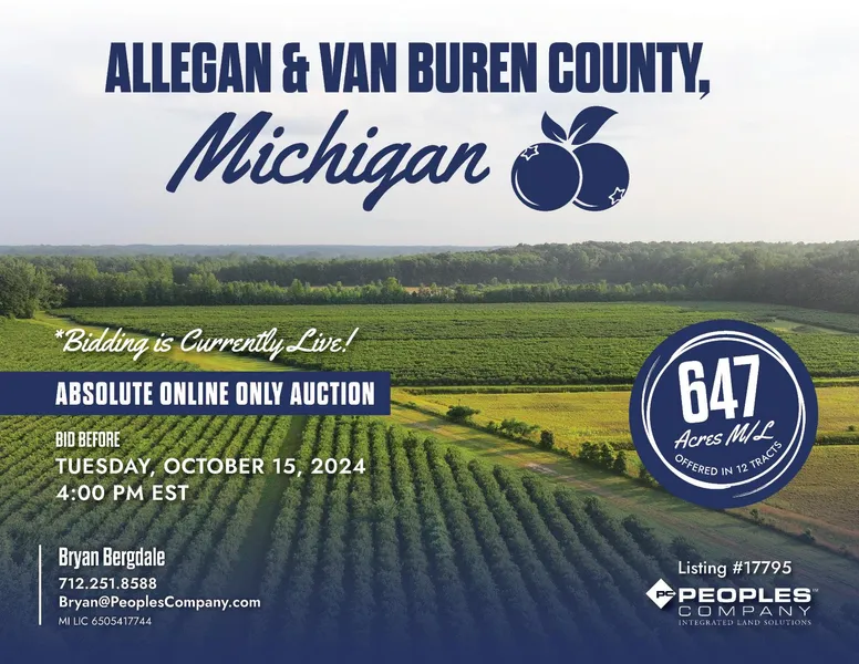 Peoples Company is pleased to offer a blueberry portfolio located in Van Buren and Allegan County, Michigan. These assets total 647.13 acres m/l and feature multiple varieties of blueberry plantings that will be offered in twelve individual tracts, with tract sizes varying from 4.96 acres m/l to 118.72 acres m/l. There are currently 469.33 acres m/l of planted blueberries on the farms with a mix of drip and overhead irrigation installed.