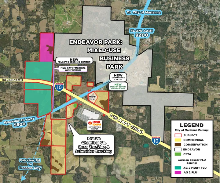 Legacy investment opportunity- 649.93 +/- Acres in all four quadrants of I-10 Exit 136. Some Commercial demand available today for development. Some of subject Marianna City annexed and zoned commercial. Water and Sewer available. Possible uses Travel Centers, Warehouse Distribution, RV Resorts, Restaurants, Hospitality, Industrial, Distribution, and Residential. This intersection being incentivized for development by Jackson County, with their recent approval of the the adjacent 1,200 acre Mixed-use- Endeavor Park.