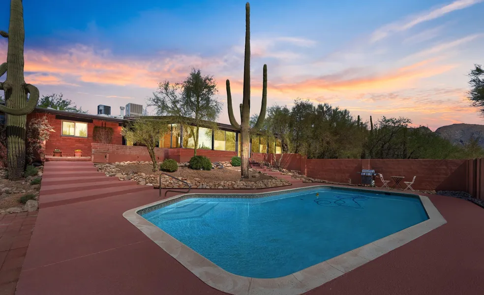 Classic mid-century modern architecture meets thoughtful, high-end reimagination in this exceptional 1963 adobe set on a private .88-acre lot in the Catalina Foothills. With 4 bedrooms, 3 bathrooms, and 2,779 square feet, the home has been meticulously updated while honoring the clean lines and warmth of true MCM design. An understated exterior gives way to beautifully carved double wood doors, clerestory windows, and light-filled interiors. The inviting living room is anchored by a striking masonry wood-burning fireplace that contrasts perfectly with the home's architectural simplicity and flows seamlessly into the main living spaces. The kitchen is a true focal point, featuring custom exotic wood cabinetry crafted from a single tree specimen, white quartz countertops, and a