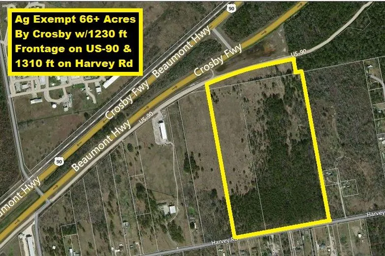 Ag Exempt 66+ Acres by Crosby w/1230 ft Frontage on US-90 & 1310 ft on Harvey Rd. Can be subdivided! Minimum 10 acres! Needs Well & Septic! No City Water/Sewer! Only 13 mi. East of BW-8. Just 18 mi. to I-10 & TX-146. 30 mi. to Downtown Houston, Bush Airport & Lake Houston. Great location for Car Dealership, Church, University, Strip Center, Gas Station/C-Store, Drive-Thru Truck Stop, Hotel, Warehouse/Storage, Hospital, Shopping Mall, Distribution Center, Retail Center, Apartments, RV Park/Campgrounds, Supermarket or Commercial Business w/Billboard for Maximum Exposure.