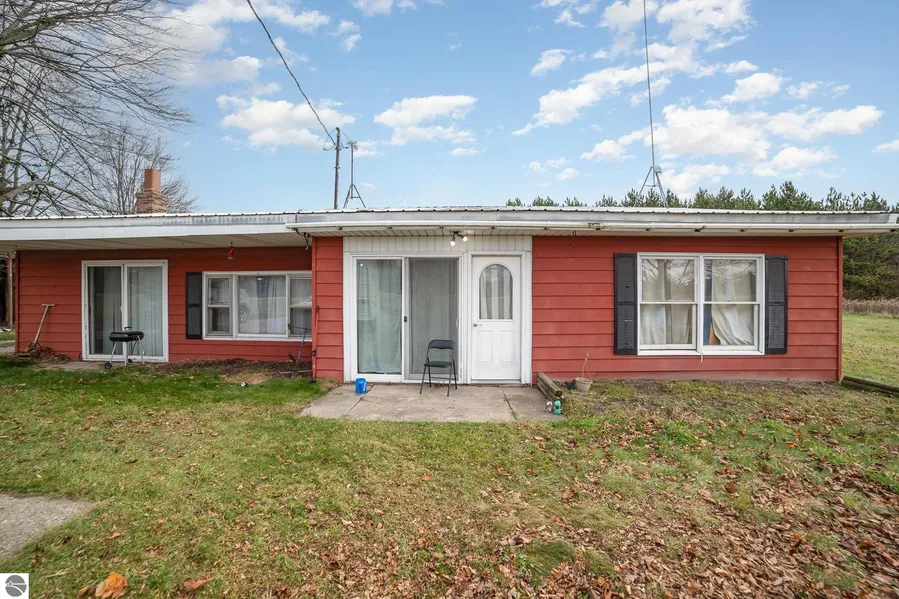 Discover this delightful two-bedroom, one-bath home set on almost an acre of land. This property includes a detached one-car garage and a spacious pole barn, providing plenty of room for storage and recreational vehicles. The serene backyard creates a peaceful rural setting. The kitchen offers abundant cabinet space, and both bedrooms are spacious and comfortable. The large living room features a charming brick wood fireplace and a big picture window, adding to the warm and welcoming feel of the home.
