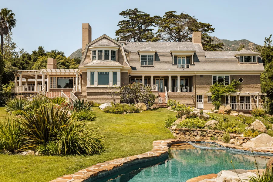 Welcome to Lilac Manor, a stately Cape Cod home nestled on Montecito's most coveted street. This magnificent estate is set on 2.04 acres of fertile soils with private walking trails, a dry rock creek, and incredibly well-maintained gardens filled with mature trees and rare plants that bloom year-round. Step across the motor court into the grand foyer with inlay hardwood floor, you will be greeted by an elegant living room with breathtaking views of the manicured grounds to the ocean and islands beyond. The living room offers soaring double height ceilings surrounded by a library on the upper level for cozy lounging or quiet reading. Oversized French windows and doors perfectly frame the tranquil gardens, offer an abundance of natural light, and provide a seamless flow to the covered porches outside. The well-appointed floor plan offers grand-scale public rooms, with handcrafted millwork and stunning red oak floors throughout. The open kitchen is equipped with top-of-the-line appliances, including a double-wide Gaggenau fridge/freezer, a huge center island with natural quartzite countertop, and overhead skylights. It opens directly to the formal dining room and family room - perfect for entertaining. The primary suite occupies an entire wing on the second floor and is outfitted with a beautiful sitting area with fireplace and private ocean-view balcony, a dressing room with wet bar, and dual walk-in closets and bathrooms. Two additional ground floor bedroom suites and a lower-level office/recreational area complete the main residence. Outside, the verdant gardens boast a variety of amenities and luxuries, including a charming storybook one-bedroom cottage, and a studio apartment above the garage with private driveway. Additional outdoor amenities include a sparkling crescent-shaped pool with built-in spa, entertainment decks, and an outdoor kitchen under a wisteria-covered dining pergola. Meandering paths lead you through lush plantings and tree canopies to the lower level with a tree house, vegetable bed, secret garden in the woods, and the dry creek. Hidden from the road behind mature vegetation, Lilac Manor's privacy is assured with three gated entries and its location on a peaceful lane tucked away in Montecito. Conveniently situated near Montecito Upper Village shops, restaurants, and Birnam Wood Golf Club, this estate offers serenity with breathtaking ocean vistas and is a true garden lover's paradise.