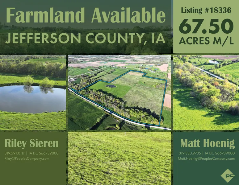Peoples Company is proud to present 67.5 acres m/l of farmland situated in Jefferson County, Iowa. This property offers a combination of high-quality CRP and pasture acres for income, hunting, and livestock grazing. The farm consists of 54.39 FSA cropland acres carrying a CSR2 rating of 56.1 with a primary soil type of Clinton Silt Loams. Containing a mix of native grasses allows abundant wildlife to use this property as a travel corridor, including whitetail deer and plenty of pheasants. The farm is located in Section 22 of Lockridge Township in Jefferson County, IA.