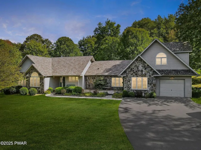 A one-of-a-kind 67-acre private country estate just 15 minutes to Honesdale and 25 minutes to Elk Mountain, this remarkable property features 6 bedrooms, 4 bathrooms, multiple living areas, and exceptional outbuildings, all surrounded by breathtaking scenery. The paved quarter-mile driveway winds through rolling fields, fruit trees, and miles of historic stone walls, leading to a striking stone-and-vinyl residence carefully maintained by the same family for years. Step inside to bright living spaces filled with natural light and countryside views. A brick wood-burning fireplace anchors the expansive main living area, where the open kitchen, dining room, and sunroom connect seamlessly. The kitchen offers granite countertops and quality cabinetry, while the sunroom's walls of windows frame the serene landscape. The main-level primary suite is a retreat with vaulted ceiling, spa-like bath featuring a jacuzzi tub with views, walk-in shower, and spacious walk-in closet. Two additional bedrooms, a tiled full bath, and convenient laundry complete this wing. The finished lower level impresses with a sprawling family room accented by stonework and a bar, built-in cabinetry, an office/craft room with refrigerator, abundant storage, and a workshop. A highlight of this estate is the separate living quarters, with its own entrance, primary suite, full bath, office, generous living/dining area with kitchenette, plus two more bedrooms and another full bath upstairs--perfect for extended family, guests, or an in-law setup. Outdoors, relax on the expansive deck and porch while overlooking rolling acreage, miles of stone walls, and extensive stream frontage for fishing, swimming, and recreation. Outbuildings include a 30x40 insulated workshop with wood burner, a 40x40 storage barn, and a detached stone-front garage with stove and workspace. This extraordinary property offers unmatched privacy, beauty, and timeless character--an estate of this scale and setting is truly rare.