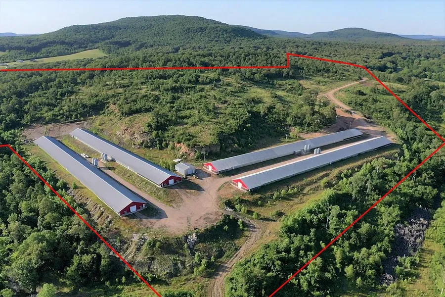 High producing recent construction Tyson farm! 3 barns are 55x600 and one is 55x550 producing an annual gross income about $360,000 from 7 week birds and 5.5 flocks per year. Land is hilly but there is space enough for building two more barns when Tyson wants more production. Well water with public water backup, propane, pump house, 1997 two bedroom home 30x40 shop with concrete floor and good fences. Seller's financials will be provided to interested buyers upon screening of buyer's qualifications. As all modern chicken farms are, this one is biosecure, and no entrance or tour is permitted without prior list agent approval.