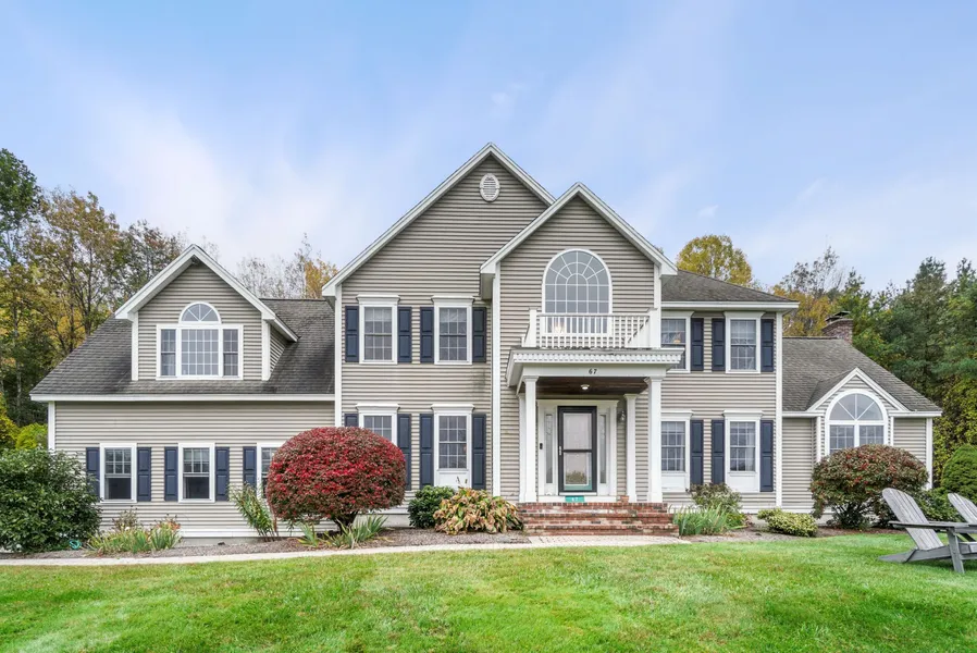 Welcome to 67 Sky Top Ln in Dunstable MA a 4 bed 3 bath Colonial home. This property sits high on 2.5 acres abutting hundreds of acres of conservation land and trails at the end of a cul- de sac in the sought after meadow view estates neighborhood. Plenty of room here as the 1st floor offer a large eat in kitchen with granite counters, stainless steel appliances, peninsula and wet bar which leads to a front to back family room with cathedral ceilings and pellet fireplace. A formal wianscott dining room, traditional living room / office, 1/2 bath and laundry complete this level. Upstairs includes 4 large bedrooms a full bath and a massive primary bedroom with vaulted ceilings, sky lights and spa inspired en suite bath with double vanity, glass shower and jacuzzi tub. The finished basement offers tons of extra space and is perfect for entertaining and includes a wood burning fireplace and ...