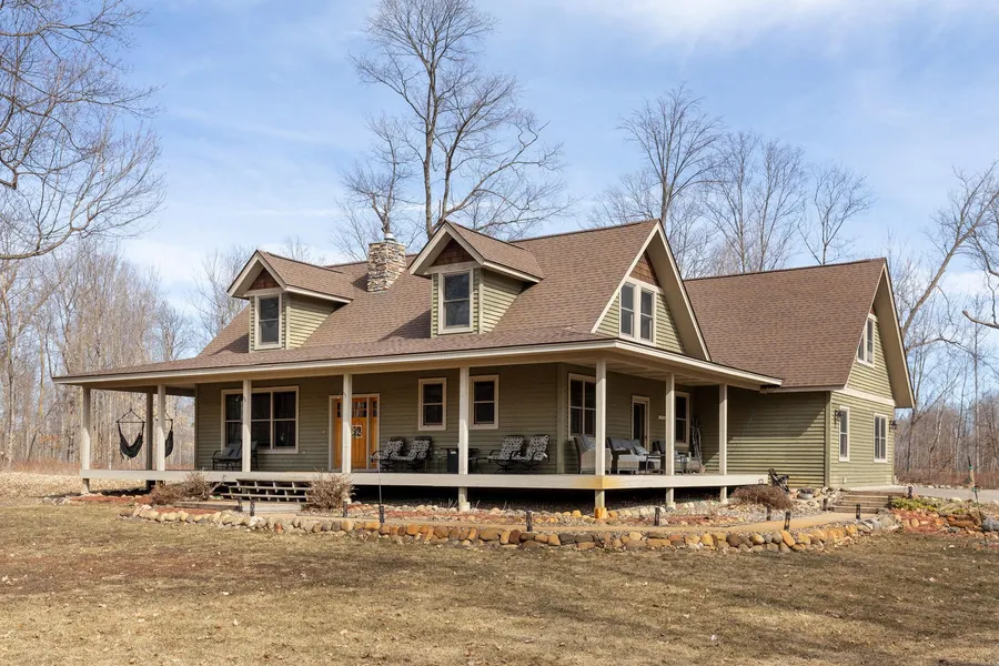Country retreat located on nearly three wooded acres nestled between Round and North Long lakes. This charming four bedroom, four bathroom home with its wrap around porch and hot tub offers the perfect blend of country living and privacy. One level living with main floor primary bedroom and main floor laundry. Home also offers a fully functional additional main floor living space that could be used as an in-law suite. Some recent updates include new hardwood flooring, new kitchen backsplash and countertop, new refrigerator and hot tub in 2021 and newly paved driveway and outdoor fire pit area. Bonus room with its own private entrance is being used as a large home office. Potential for additional bonus room above unattached garage. Quality and Privacy describe this home right in the heart of the lakes area and only minutes to the Round Lake or North Long lake public landings.
