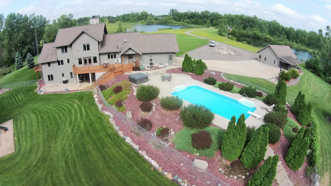 This is a sportsman's heaven on earth! 68 acres, 5000 square foot home, 5 bedrooms, 3.5 baths, 25 acres of private spring fed lakes, stocked with 6lb Bass, 20lb Northern Pike, large Crappie and Bluegill, great fishing year round. Excellent hunting with large Deer, Geese, Duck, Turkey and Rabbit populations. This property is protected to the south by a 1/2 mile of Maple River Frontage and to the East by an old rail road grade. The rest of the property is surrounded by farm land. In addition to the 2 car attached garage this property features a 50'x26' 4 car detached garage with concrete floors, 100 amp electric service, water hydrant and door openers on each over head door. Off of the rear of this garage is a 14'x30' covered patio with 5 separate dog kennels. To the rear of the house is a large cedar deck that walks down to the fenced pool area and 36'x18' in-ground pool and hot tub. The ...