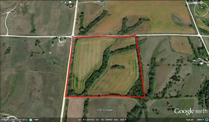 68.55 acres to be sold at auction in two tracts at 10 Am April 26th Saint Marys Hall. Tract one offers 27.58 acres m/l including 19.4 acres cropland per FSA. Balance of the farm is grass waterways, small timber patches and a pond. The weighted average CSR on the tillable acres is 53.7. Tract two offers 40.97 acres including 30.6 cropland per FSA. Average CSR on tillable Acres is 46.7. Non-tillable acres include a small timber draw. Both tracts are rented for 2013 at $270 per acre. Rent money will be paid to the buyer at closing.